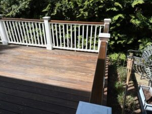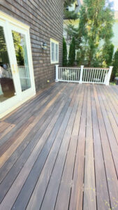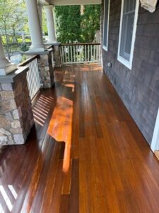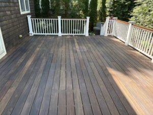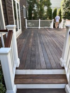 This deck in Greenwich, CT received a full maintenance treatment, including staining and painting, to protect the wood and restore its clean, polished look.